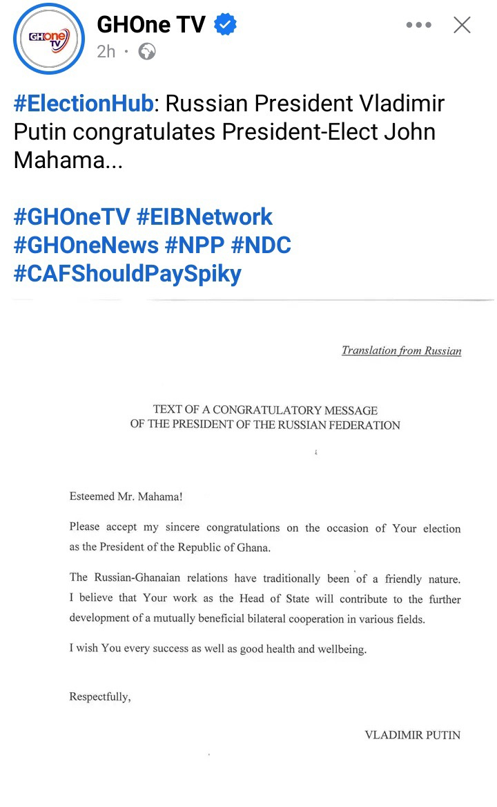 Text of the Russian Federation President's Congratulatory Message Distinguished Mr. Mahama! I would like to extend my heartfelt congratulations on your election as the Republic of Ghana's president. Historically, relations between Ghana and Russia have been cordial. As Head of State, I think your efforts will help advance bilateral cooperation that benefits both parties in a number of areas.