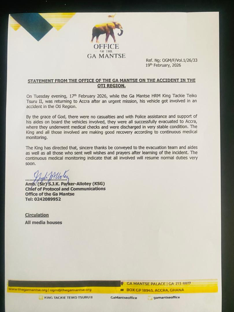His Royal Majesty, King Tackie Teiko Tsuru II, was involved in a car accident in the Oti Region on Tuesday evening, February 17, 2026, while returning to Accra from an urgent trip, according to confirmation from the Office of the Ga Mantse.