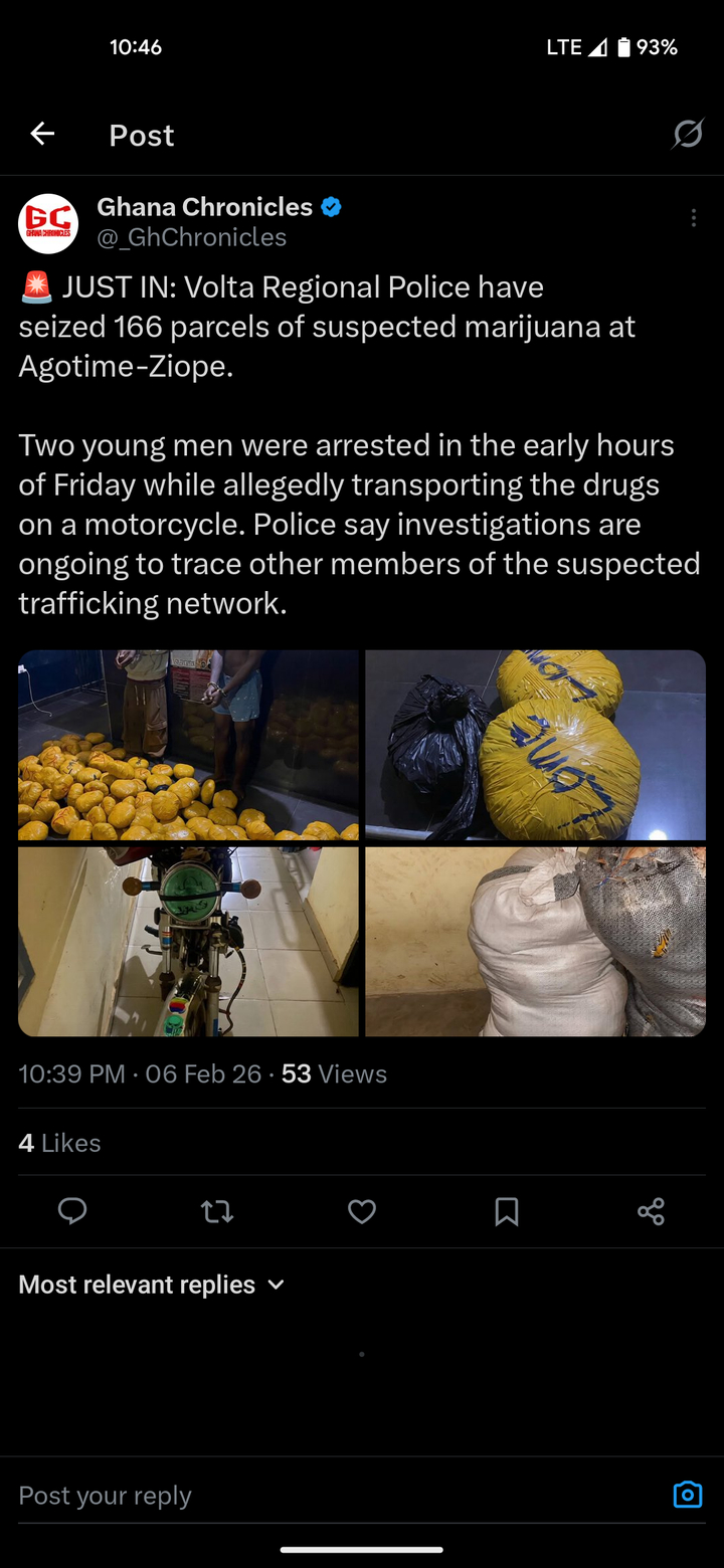 Officers stopped a motorcycle that was reportedly being used to transport marijuana, and the Volta Regional Police Command stated that 166 packages of suspected marijuana had been seized.Two young males are currently being held by the police as they help with investigations after being apprehended at the site.