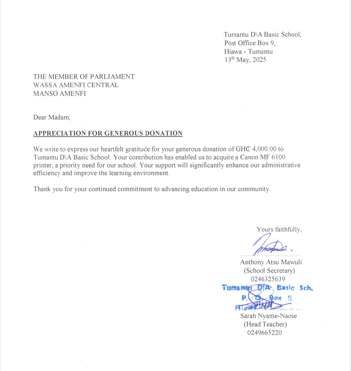 The headmistress of Tumantu D/A Basic School, Sarah Nyame Naose, on behalf of the school, expressed heartfelt gratitude to the MP for the kind gesture. She stated that the photocopier/printer would significantly enhance the smooth running of academic activities in the school.