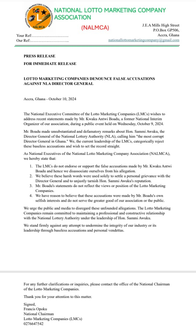 Accra, Ghana – October 10, 2024: The National Executive Committee of the Lotto Marketing Companies (LMCs) has firmly rejected recent accusations made by Mr. Kwaku Antwi Boadu, a former National Interim Organizer of the association, against Hon. Sammi Awuku, the Director General of the National Lottery Authority (NLA).
