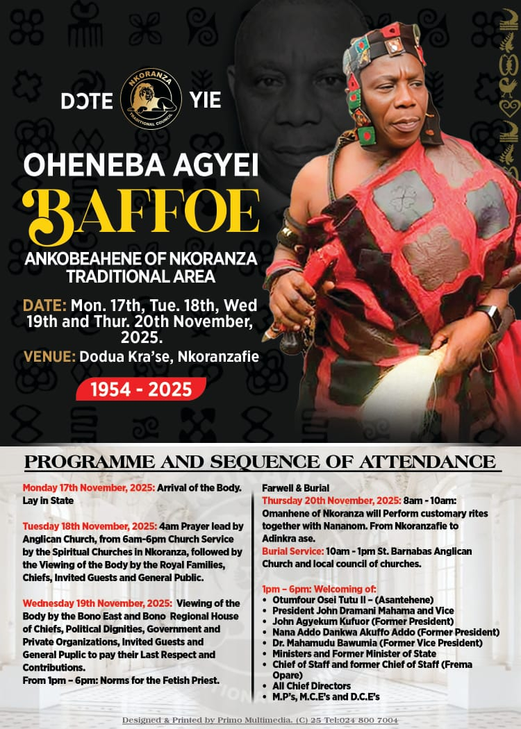 Nkoranza, Ghana – The Nkoranza Traditional Area is set to host a four-day funeral and burial ceremony for its revered Ankobeahene, Doteyie Oheneba Agyei Baffoe, scheduled from Monday, November 17th, to Thursday, November 20th, 2025. The solemn event, which promises to draw a wide array of dignitaries and the general public, will take place at Dodua Kra'se, Nkoranzafie.