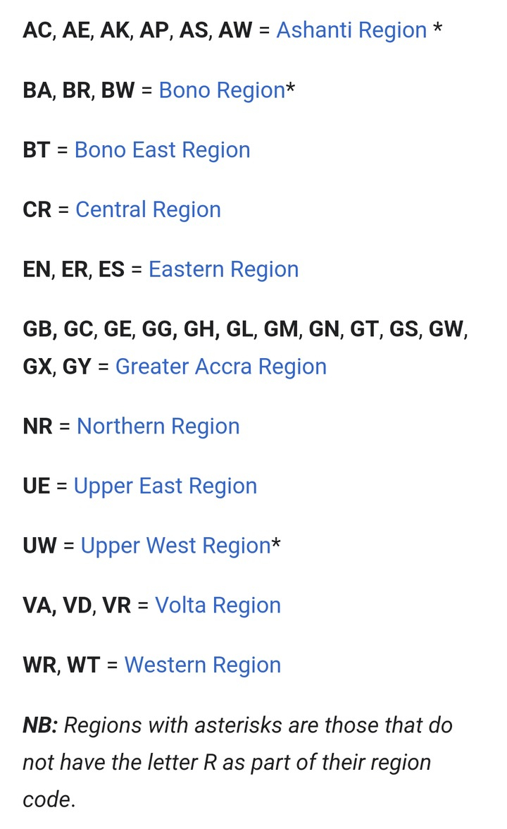 Greater Accra Region: GS, GW, GB, GC, GE, GG, GH, GL, GM, GN, GT, GS, etc.