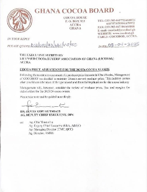 In a letter dated April 8 addressed to the Licensed Cocoa Buyers’ Association of Ghana (LICOBAG), COCOBOD cited a comprehensive review of the cocoa sector’s current financial and operational climate as the basis for maintaining the existing price structure.