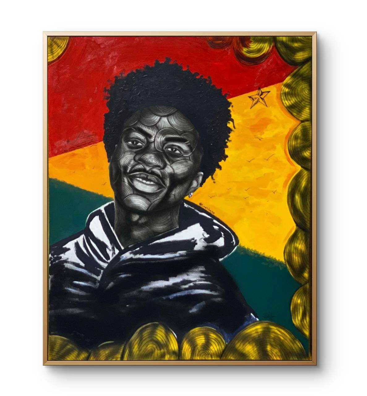 What elevates the piece beyond admiration is the stunning backdrop: a bold, colorful explosion of Ghanaian essence. Eric draws from the country's rich visual language—lush deep greens of tropical landscapes, warm golden earth tones, fiery reds and yellows reminiscent of kente cloth patterns, bustling market energy, and subtle cultural icons like the Black Star or Adinkra symbols woven in seamlessly.