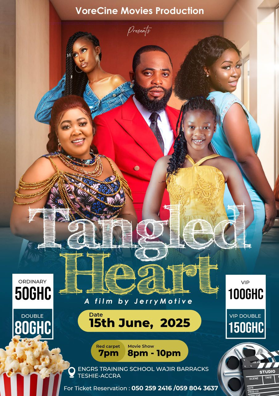 Accra’s movie scene is about to get emotional, intense, and deeply personal with the upcoming premiere of Tangled Heart, a new Ghanaian film by director Jerry Motive. Produced by VoreCine Movies Production, this powerful drama is scheduled to premiere on Sunday, June 15, 2025, at the Engrs Training School, Wajir Barracks in Teshie.