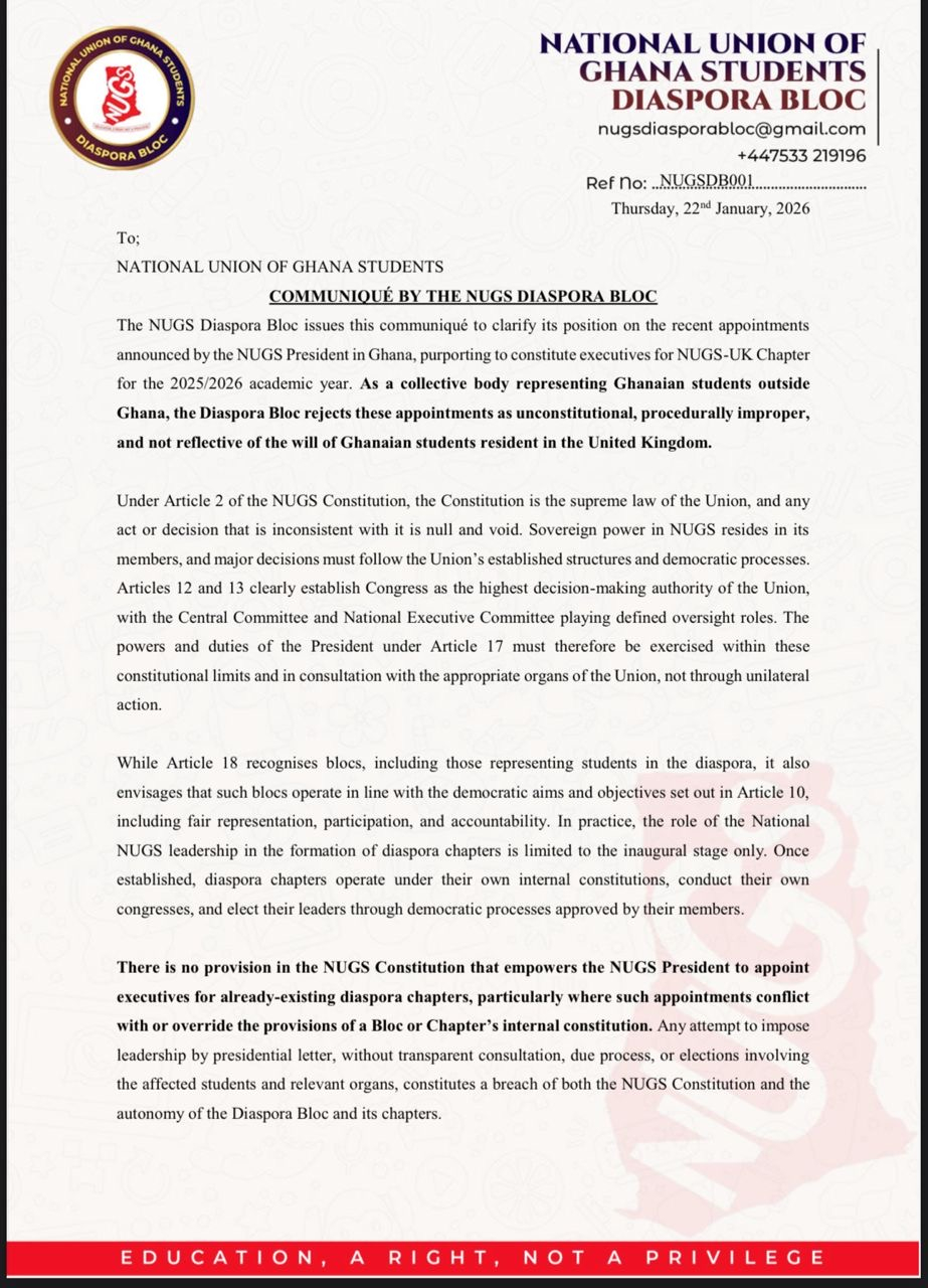 The NUGS Diaspora Bloc issues this communiqué to clarify its position on the recent appointments announced by the NUGS President in Ghana, purporting to constitute executives for NUGS-UK Chapter for the 2025/2026 academic year.