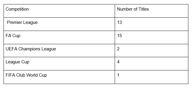 2. Consistent success: Securing 13 Premier League titles, 5 FA Cups, and 2 UEFA Champions League titles.