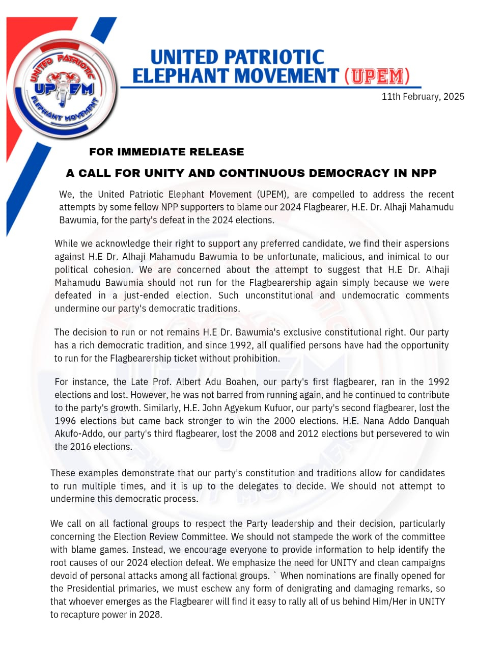 UPEM is calling on all party faithful to remain calm and focused, avoiding any actions that could undermine our party's UNITY. We must work together to ensure our party emerges stronger and more UNITED than ever.