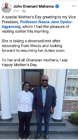 “A special Mother’s Day greeting to my Vice President, Professor Naana Jane Opoku-Agyemang, whom I had the pleasure of visiting earlier this morning. She is taking a deserved rest after recovering from illness and looking forward to resuming her duties soon. To her and all Ghanaian mothers, I say Happy Mother’s Day.”
