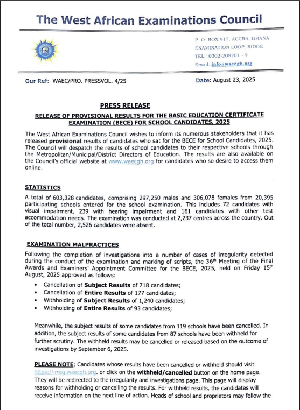 WAEC extended its gratitude to all partners—including the Ministry of Education, the Ghana Education Service, security agencies, school heads, invigilators, and examiners—for their invaluable support in ensuring the successful administration of the exams and the timely release of the results.