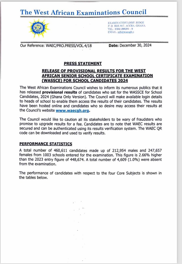 The West African Examination Council (WAEC) issued the 2024 WASSCE tentative results for school candidates today.